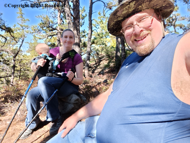At which point Whisperin' said she thinks she could help carry our little one. But I still carried the additional bag which was fine. I'll admitt that carrying my son, and the pack was tough. It was essentially hauling 50 or 60 lbs up the hill in stead of just 30 lbs. But I was pressing forward, though I did find I needed more water to keep my muscles hydrated.