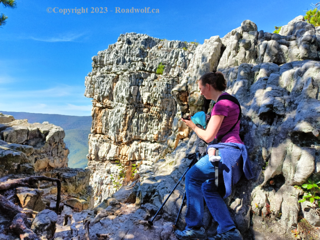 The second part of the hike happened after you reached the first overlook. From there we could see the Motel where we had stayed the night before. I peed over the edge of the rock cliff and it was quite fun. Whisperin' and I both played it safe and didn't venture closer than a few feet from the edge.