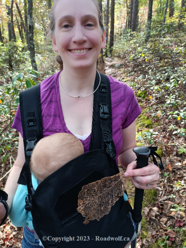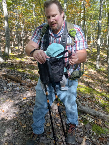 Whisperin' had some muscle pains early on, so I ended up carrying both our little one in his carrier on my chest, and the gear pack on my back. I did this for almost a mile up the hill, and about 1000 feet.