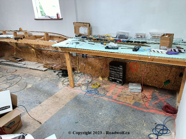 The Loft features a 8ft by 3ft built in work bench. This bench is mostly for electronics work, but also features a work station, and will be a ham radio 'shack'. The train room will feature a slide out work area which will allow models to be worked on and painted. Rolling supply drawers will exist to compliment that area. It will be located under the Thomson Bay town site, which is pictured here.