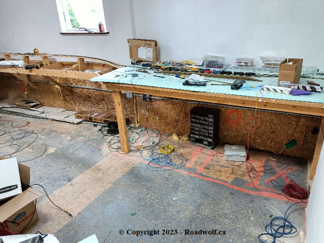 A slide out work space should be able to be easily constructed in this area. The one thing that has been a bit of a barrier, has been how I finish the area below the layout benchwork? Originally, i was going to do dark oak removable paneling, which would the unfinished area below. It would of needed to be removable because of the wiring and other needs that would be under the benchwork for the model railroad. But today, the idea of oak paneling seems a bit expensive. So there needs to be another solution. One thought would be to just paint the area. Maybe a dark color like black, in an effort to hide it. Another thought would be to drywall up to the level of the conduit, and finish that like a normal wall, then put a finished skirt of painted MDF board along the edge of the layout which would extend far enough down to hide the unfinished area. I am open to ideas on this one.