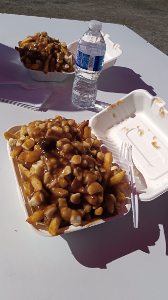 We went to a few stores, and purchased some artistic keepsakes at one store. I ended up buying her a stained glass light catcher. I also wanted to get her a new sweater. She ended up choosing a ROOTS Canada navy blue zip up sweater, which is super comfy. And also iconically Canadian! Part of me thinks that she secretly wants to move up to the area and live there. We then stopped at a park for our son's sake and then headed back out towards my mom's place again. I saw a 'chip wagon' and needed to stop to get authentic Poutine! Probably the third 'poutine' I had had the entire trip, but, meh... These servings were huge tho! I am still working on leftovers from it.